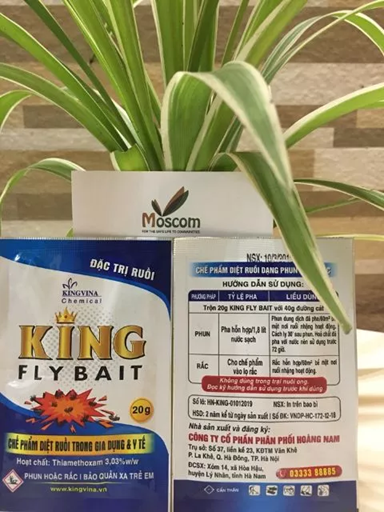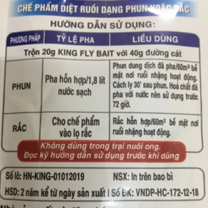 Thuốc diệt ruồi King Fly Bait là sản phẩm đặc trị ruồi được sản xuất tại Việt Nam, chứa thành phần dẫn dụ ruồi tốt và tiêu diệt nhanh chóng, đạt hiệu quả cao. Sản phẩm ưa chuộng sử dụng diệt ruồi trong gia dụng và y tế.
